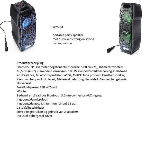 klein compact maar toch alle handige opties zoals karaoke bleutooth 13uur gebruikers duur op de accu verlichting en een bedrade microfoon en 180wat muziek vermogen maak kennis met deze handzame speaker op jou feestje