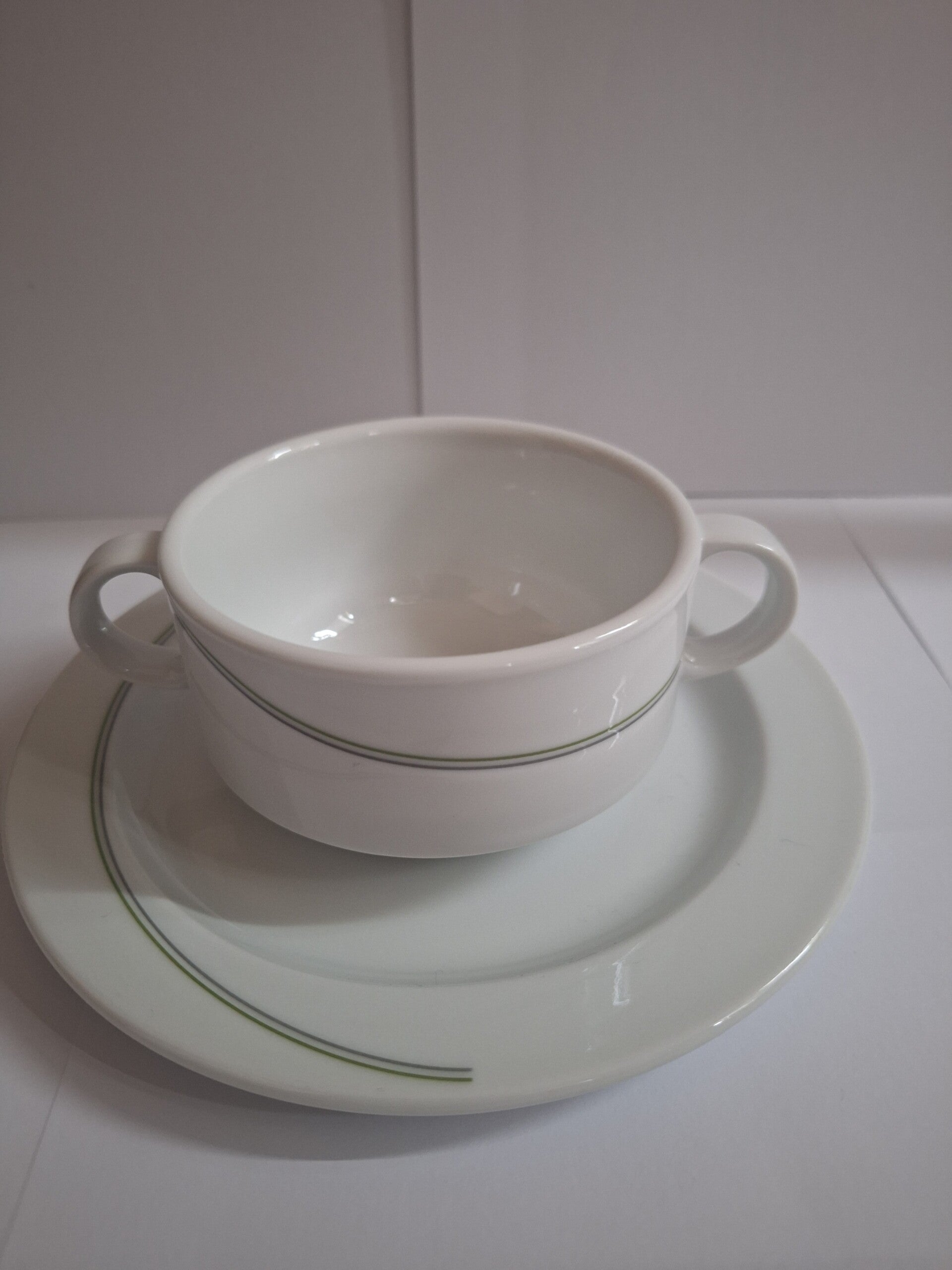 Mooie set soepkomen welke ook gebruikt zouden kunnen worden als vla bakjes tijdens het diner,het betreft een set inclusief bij passende schotel verhuur per 10 stuks